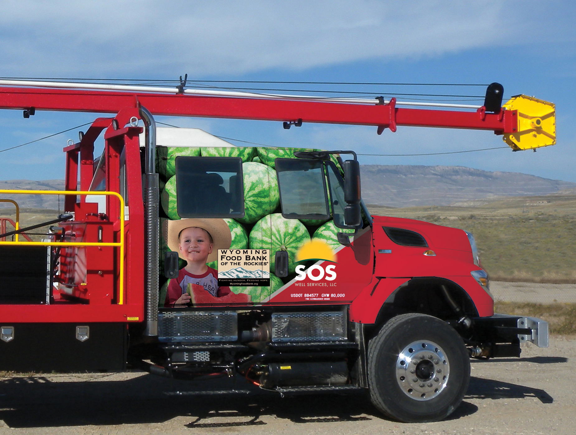 La Barge, WY, October 3, 2019 — SOS Well Services, LLC has wrapped the cab of a swab rig in its fleet with themed graphics to draw attention to the cause of ending hunger in Wyoming, while on the job and on the road. In addition to helping raise awareness, SOS Well Services has pledged a percentage of yearly revenue from operation of the rig to Wyoming Food Bank of the Rockies.